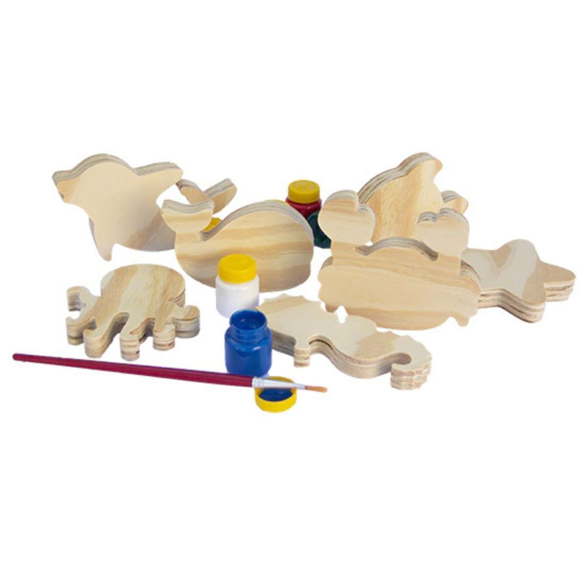 Peças em MDF com desenhos do fundo do mar, prontas para colorir.